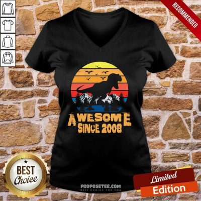 Vintage Awesome Since 2008 13 Year Old 13th Birthday Gift For Dinosaur Boy V-neck