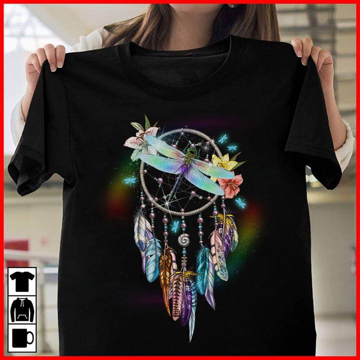 Crystal Colors Feathers Dream Catcher And Colorful Flowers Dragonfly Shirt